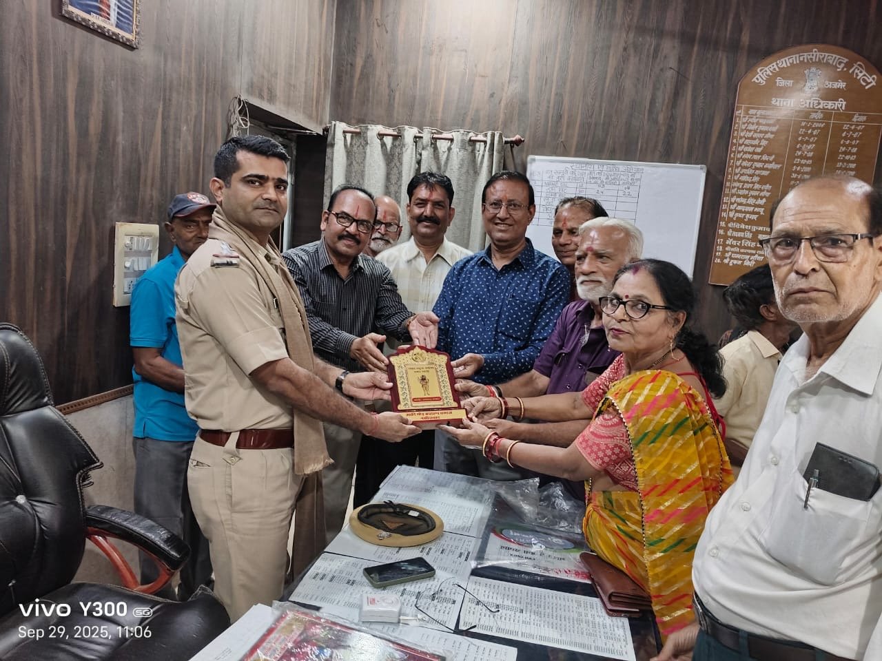 नसीराबाद ( योगेन्द्र बुलचन्दानी ) राजस्थान पेंशनर्स समाज नसीराबाद उपशाखा अध्यक्ष गजानंद शर्मा के नेतृत्व में पेंशनर्स समाज के लोगों ने नव नियुक्त सिटी थाना प्रभारी अनिल देव कल्ला का स्वागत कर स्मृति चिन्ह भेंट किया इस अवसर पर पेंशनर्स समाज के अध्यक्ष गजानंद शर्मा ने सी एल जी में पेंशनर्स समाज के भी 2सदस्य शामिल किए जाने की मांग की जिस पर थाना प्रभारी द्वारा उन्हें सकारात्मक सहयोग का आश्वासन दिया गया इस अवसर पर पेंशनर्स समाज उप शाखा नसीराबाद के संरक्षक रामेश्वर कच्छावा, मास्टर राम लाल सुरेश शर्मा, वरेश भारद्वाज, प्रकाश शर्मा, विजय शर्मा, माया गुप्ता, कामिनी शर्मा सत्य नारायण खंडेलवाल, देवी लाल शर्मा दिलीप राय शर्मा आदि मौजूद रहे