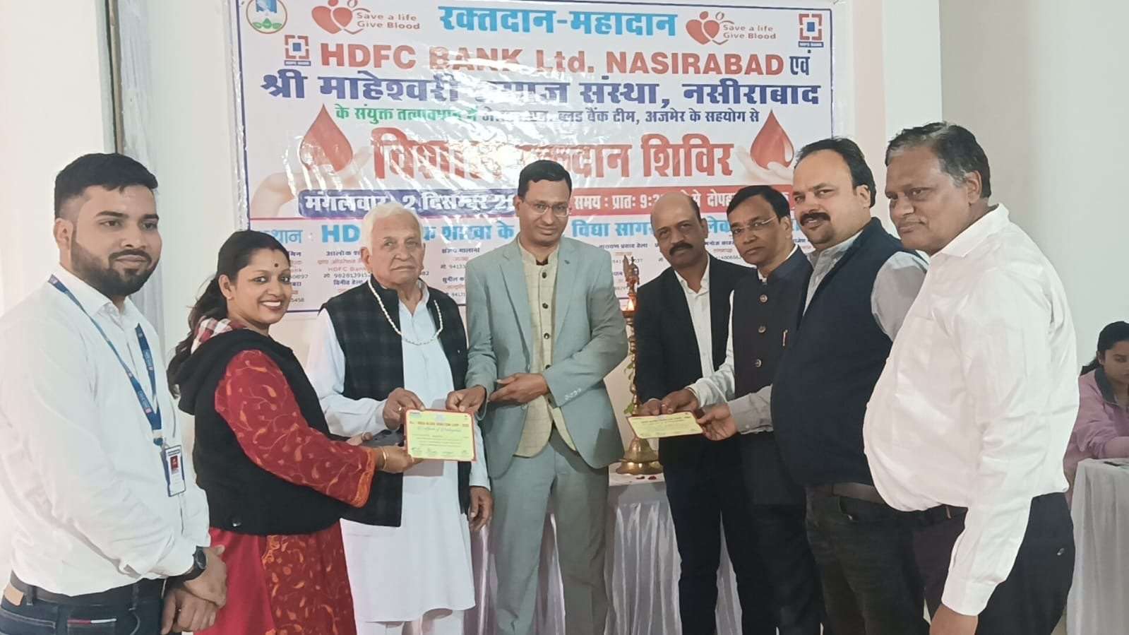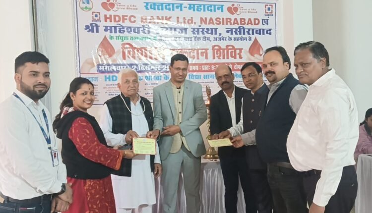 नसीराबाद( योगेन्द्र बुलचन्दानी )एचडीएफसी बैंक लिमिटेड स्थानीय शाखा एवं श्री माहेश्वरी समाज संस्था नसीराबाद के संयुक्त तत्वावधान में आज विशाल रक्तदान शिविर आयोजित किया जाएगा, यह शिविर जे.एल.एन. ब्लड बैंक टीम, अजमेर के सहयोग से आयोजित किया जा रहा है श्री माहेश्वरी समाज संस्था के मंत्री ललित राठी ने बताया कि शिविर आज सुबह 9:30 बजे पूर्व विधायक राम नारायण गुर्जर द्वारा उद्घाटन करने के साथ शुरू हुआ जो अपराह्न 3 बजे तक सरकारी अस्पताल के पास स्थित एच.डी.एफ.सी. बैंक शाखा की ऊपरी मंजिल पर स्थित हाल में, विधा सागर कॉम्प्लेक्स, नसीराबाद में आयोजित किया जाएगा। रक्तदान शिविर के आयोजकों द्वारा अधिक से अधिक संख्या में लोगों से रक्तदान कर मानव सेवा में सहभागी बनने की अपील की गई है जिसके चलते सुबह से ही रक्त वीरों का शिविर स्थल पर आवागमन जारी है और रक्त वीरों द्वारा उत्साह पूर्वक शिविर में भाग लिया जा रहा है