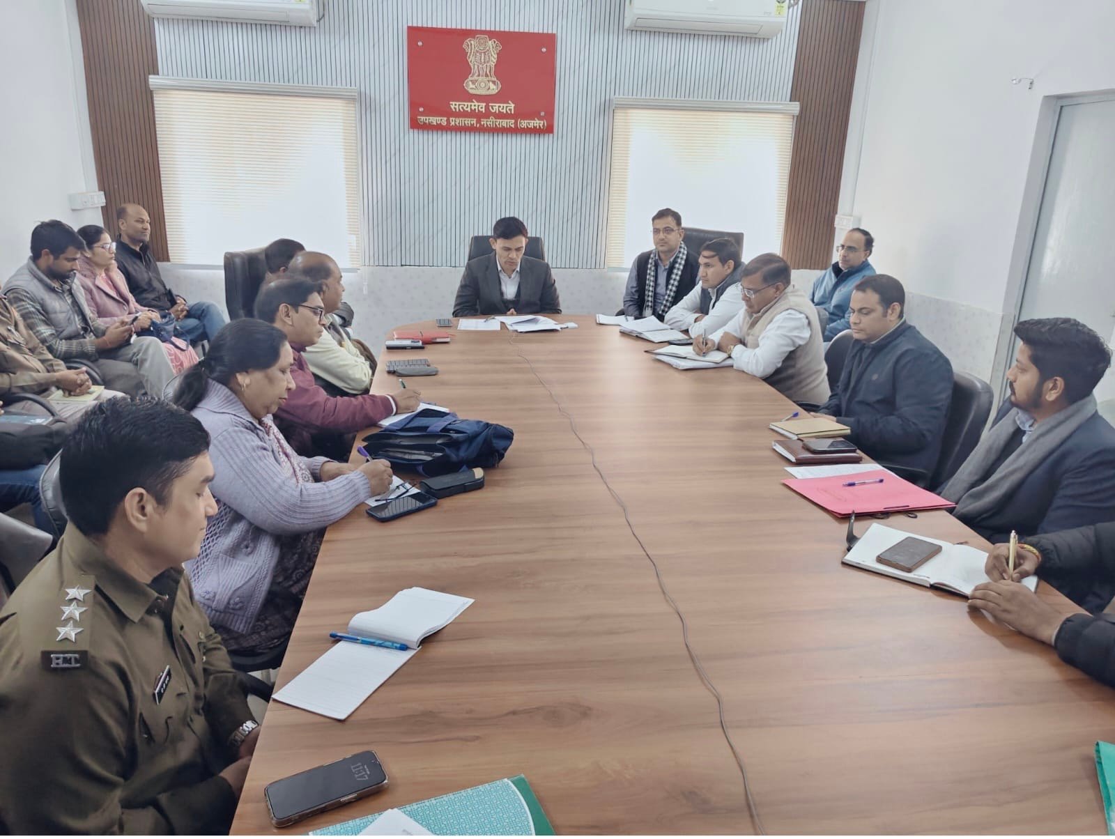 नसीराबाद ( योगेन्द्र बुलचन्दानी ) मंगलवार को स्थानीय उपखंड अधिकारी कार्यालय के सभागार में प्रातः 11.00 बजे उपखण्ड अधिकारी नसीराबाद की अध्यक्षता में ’’उपखण्ड स्तरीय गणतंत्र दिवस’’ समारोह की तैयारियों को लेकर एवं उपखण्ड स्तरीय समीक्षा बैठक का आयोजन किया गया उपखंड अधिकारी कार्यालय में आयोजित बैठक में समस्त ब्लाॅक स्तरीय अधिकारीगण द्वारा उपस्थिति दर्ज कराई गयी। जिसमें उपखण्ड स्तरीय गणतंत्र दिवस समारोह के सफल क्रियान्वयन एवं आयोजन बाबत् उपस्थित संबंधित अधिकारीगण को आवश्यक दिशानिर्देश प्रदान किये गये इसके उपरांत बैठक में उपस्थित समस्त ब्लाॅक स्तरीय अधिकारीगण से विभागवार फलैगशिप योजनाओं की प्रगति व विभागीय आन्तरिक मुद्दो पर समीक्षा की गयी समीक्षा उपरांत संबंधित अधिकारीगण को आवश्यक दिशानिर्देश प्रदान किये गये।