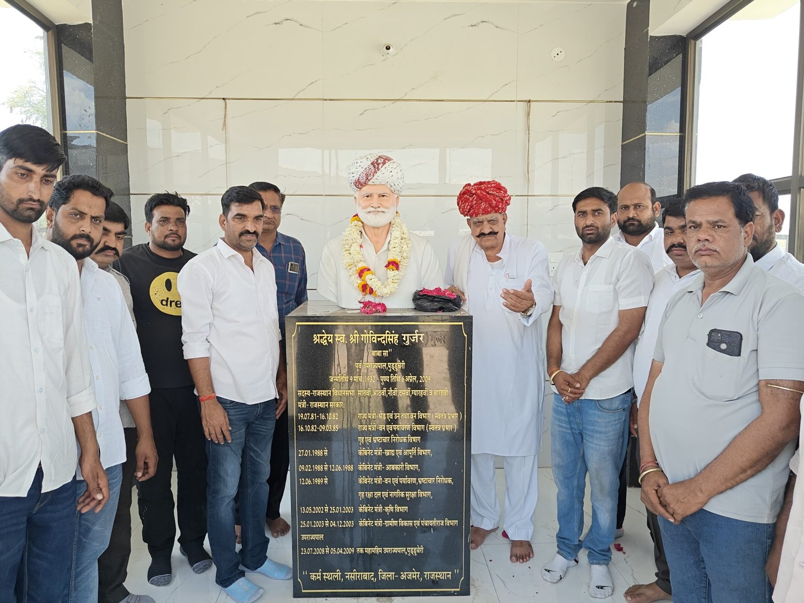 नसीराबाद ( योगेन्द्र बुलचन्दानी ) स्थानीय नेशनल हाईवे पर कोटा चौराहा स्थित गोविंदसिंह गुर्जर स्मारक पर पूर्व पीसीसी सचिव एवं विधायक महेंद्र सिंह गुर्जर के सानिध्य में श्रृद्धांजलि कार्यक्रम का आयोजन हुआ इस अवसर पर ओबीसी के जिलाध्यक्ष अशोक गुर्जर, युवा नेता हरेन्द्र सिंह,लोकेन्द्र गुर्जर फैजान हसन, राहुल गुर्जर,ईमरान कुरेशी,प्रह्लाद तेलां छात्र नेता करण, भागचंद गुर्जर, अंकित चौकड़ीवाल,गौतम गुर्जर,बल्ली, रोहितशर्मा,गोविंद वाल्मीकि, एकराम कुरेशी, नवीन चावला,सोनू रेगर,यूसुफ,रजत गुर्जर, गजेंद्र चावला,आसिफ़ खान,गौरव शर्मा आदि ने बाबा साहेब के नाम से मशहूर स्व गोविंद सिंह गुर्जर को पुण्यतिथि के अवसर पर याद करते हुए भाव भीनी श्रद्धांजलि अर्पित की कार्यक्रम में युवा कांग्रेस के पदाधिकारी गण भी मौजूद रहे